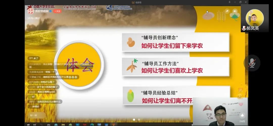 本期分享会的主讲人是河北北方学院教师刘岩,2021年被评为“最美高校辅导员”。刘老师通过讲述和同学们在田野乡间的那些事,向我们传递了农科类院校的辅导员该如何做好耕读教育。他通过自身经验总结出的“861工程”更是值得我们去借鉴和学习,坚持思政教育全方位融入、全过程渗透的原则,明确培养卓越的三农人才目标,扭住牢固树立对党的科学理论的信仰这个中心,找准员工学科素养及职业能力提升的着力点,构建以党建带团建、将团建融入党建的系统,确保牢牢把握意识形态安全的红线和底线思维,强化社会与学校共育模式,让员工养成自我教育的习惯,真正实现思维领先化、态度情感化、服务全程化、运行机制化、自主管理化、工作特色化。