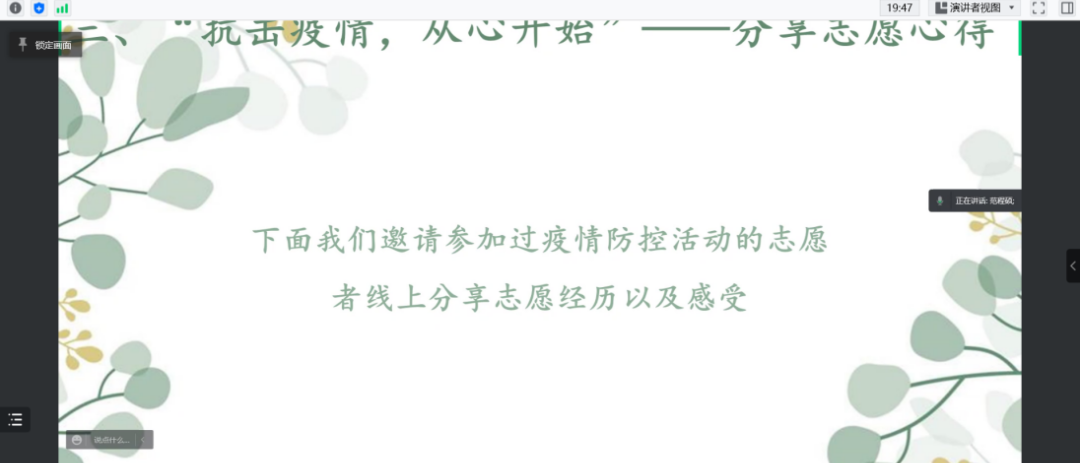 本次活动共有七项议程。分别是“疫情记录片观影”、“心理健康知识讲解”、“志愿者经历分享”、“我与父母那些事儿”、“居家花样宅投稿作品展示”、“疫情网课学习分享”、“公司心理健康咨询热线公布”七项活动内容,活动开始时,首先播放了呼和浩特市、吉林市、哈尔滨市等中高风险地区的抗疫纪录片,使同学们深刻的认识到本轮疫情来势汹汹影响重大。紧接着由吴佳益、田卓然、卜乾三位同学分享了他们假期在家乡做抗疫志愿者的经历及感受。他们充分的发扬了“奉献、互助”的志愿精神,为打赢疫情防控阻击战贡献了青春力量。激发了同学们对身处抗疫前线的“逆行者们”的感恩、敬佩之情。